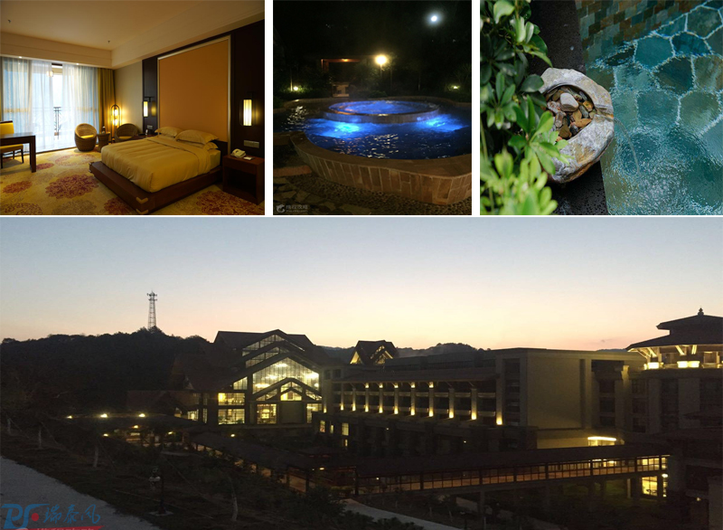 游覽了云門(mén)山,體驗(yàn)了玻璃棧道,晚上我們驅(qū)車(chē)趕往經(jīng)律論文化旅游小鎮(zhèn)溫泉度假村,其占地16.8公頃,作為一家以五星級(jí)標(biāo)準(zhǔn),并按照以“禪佛”為主題的國(guó)家級(jí)大型禪文化主題園區(qū)的標(biāo)準(zhǔn)打造的高規(guī)格酒店,園區(qū)內(nèi)集【禪修、溫泉、度假、養(yǎng)生】為一體,充分利用已有的天然氡溫泉資源、優(yōu)美清幽山景,完整詮釋自然之美,突出以【禪文化】為特色的核心理念。不得不說(shuō),這里的夜景真的非常漂亮,燈光點(diǎn)綴著的旅游小鎮(zhèn)就像是一座迷人的城堡。作為美名遠(yuǎn)揚(yáng)的溫泉酒店,來(lái)這里肯定要體驗(yàn)溫泉的,燈光和霧氣映襯下的溫泉池有種異樣的美,美的很朦朧也很溫暖!