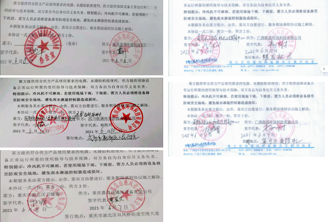 另,兩日來繼續簽下服務項目的瑞泰風愛心代表團隊有:四川歐祺環保科技有限公司、廣西歐昌環保科技有限公司、湖北瑞兆偉業通風降溫科技有限公司、嘉興道和環境科技有限公司,其中歐祺、歐昌再次收獲多項服務機會。再次熱烈祝賀重慶嘉昌達通風設備有限公司,祝賀以上各家瑞泰風愛心團隊!